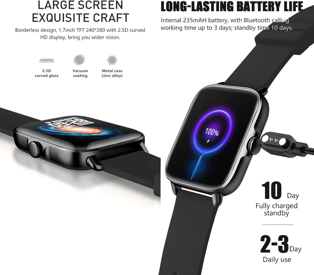 - ??1.7 inch Full Touch Screen & DIY Watch Face?Borderless design concept, 2.5D curved glass, 1.7 inch full touch screen, 240 x 280 high-definition resolution, smart watches for women and men bring a greater sense of design and a wider field of view; More than 150 different UI styles to choose from, you can also set your own image, personalized clothing should be your best daily look.